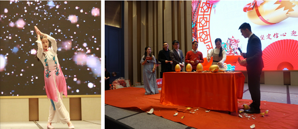 晚上18:40,充滿青春活力的銷售部開(kāi)場(chǎng)舞《卡路里》拉開(kāi)了晚宴的序幕,員工的獨(dú)唱節(jié)目《追夢(mèng)赤子心》及爵士舞蹈《來(lái)了老弟》也贏得大家陣陣的掌聲。在田總及其領(lǐng)導(dǎo)團(tuán)隊(duì)的祝酒詞中,所有員工高舉酒杯慶祝新春快樂(lè)。而主持人精心設(shè)計(jì)的新年視頻比賽、詩(shī)歌朗誦、幸運(yùn)砸金蛋等諸多游戲,同事們也都十分熱情的參與其中。