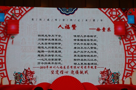 尤其值得一提的是由徐貴東原創(chuàng)的詩(shī)歌《人福贊》 :“四照光華天下安,川騖奔流薄霧間,人生自有鏗鏘夢(mèng),福造九州黎民歡,翹騰一飲杯盞酒,楚歌不消誓不還,一心只為家國(guó)事,方今歸來(lái)不自嘆,使領(lǐng)幾多將相才,命奉摧枯非等閑,于此今生皆無(wú)悔,身間不為幾貫錢,業(yè)戶立于九興道,界交國(guó)際凱樂(lè)軒,標(biāo)桿啟航三江水,榜上更勝春滿園?!辈粌H對(duì)仗工整,朗朗上口,還是一首藏頭詩(shī)“四川人福翹楚一方,使命于身業(yè)界標(biāo)榜”真的是妙啊!
